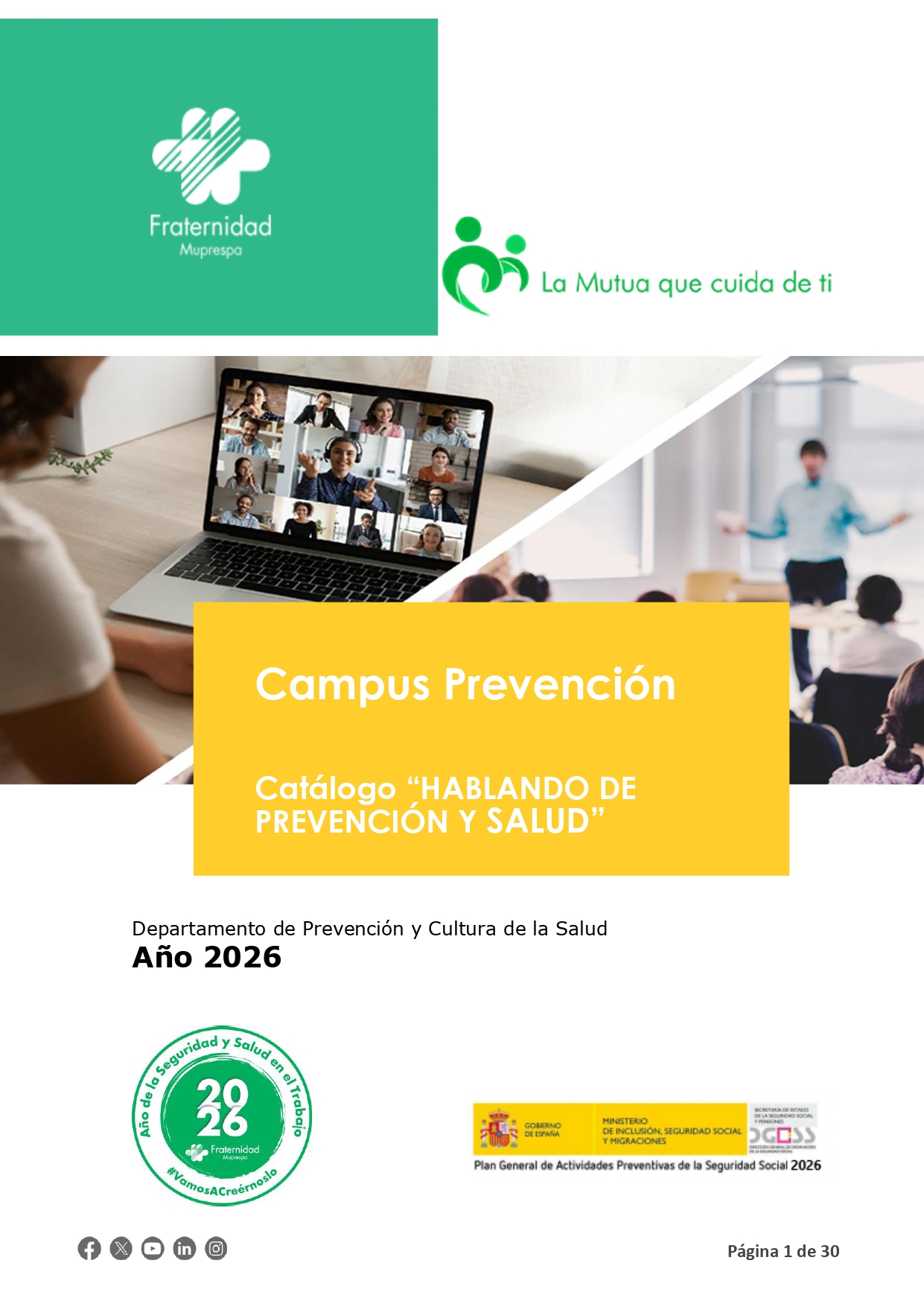 Difundir y compartir conocimiento en salud, seguridad y bienestar laboral es una de las prioridades de Fraternidad-Muprespa. Por ello, disponemos de un catálogo de ponencias con multitud de temas relacionados con la prevención de riesgos laborales y el bienestar para ser impartidas en Centros de Prevención, Institutos Regionales y Autonómicos así como cualquier institución, organismo o entidades públicas vinculados con la seguridad laboral.