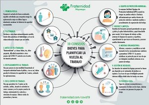 Infografía elaborada por Fraternidad-Muprespa con 10 consejos breves para planificar la vuelta al trabajo para empresas que reanuden su actividad laboral.