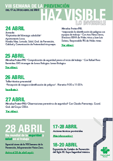 Programa de actividades de la VIII Semana de la Prevención de Fraternidad-Muprespa: "Haz visible lo invisible, identifica peligros y evalúa riesgos" que se celebra del día 27 al 28 de abril de 2023.