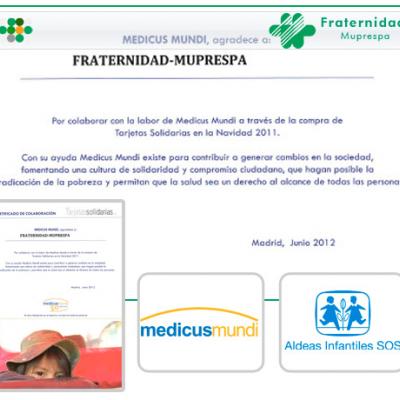 La mutua Fraternidad-Muprespa ha tenido la satisfacción de recibir el agradecimiento de Medicus Mundi, a través de un certificado, por la colaboración en la felicitación de las fiestas navideñas 2011 con sus tarjetas solidarias.
