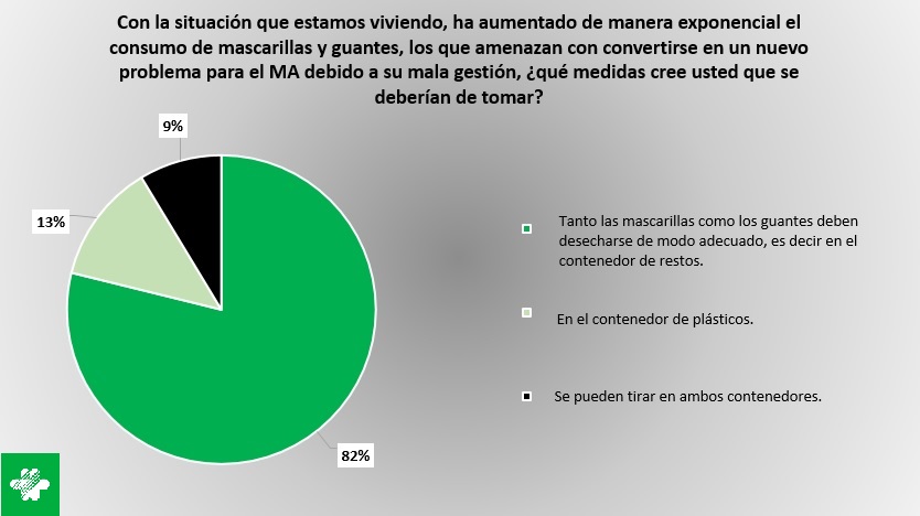 El 82% de los encuestados afirman que “Tanto las mascarillas como los guantes deben desecharse de modo adecuado, es decir en el contenedor de restos.” El 13% que el lugar de depósito es “En el contenedor de plásticos”, mientras que un 9% afirma “Se pueden tirar en ambos contenedores.”
