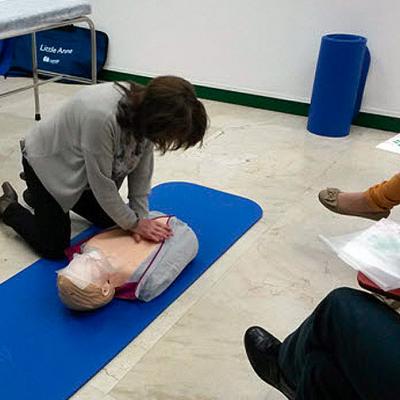D. Óscar Luquin, técnico de Prevención de Riesgos Laborales y Dª. Lidia García, D.U.E. de Fraternidad-Muprespa en Barcelona, han explicado de manera teórico-práctica como realizar un masaje cardíaco, detener una hemorragia o como actuar ante una quemadura.