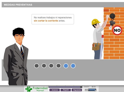 Aula prevención permite sin tener grandes conocimientos informáticos previos realizar la actividad con módulos dinámicos con preguntas y animaciones, flexibilidad en tiempo y lugar para el trabajador, tutor virtual que te irá guiando y evaluación final y diploma.