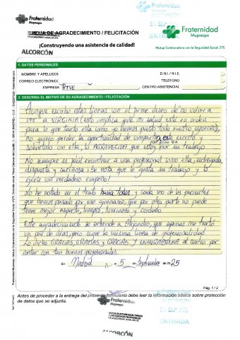 Aunque escribo estas líneas con el firme deseo de "no volver a ver" a VIRGINIA (esto implica que mi salud está en orden para lo que tanto ella como yo hemos puesto todo nuestro esfuerzo), no quiero perder la oportunidad de compartir con quien lea este escrito y sobre todo con ella, lo AGRADECIDA que estoy por su trabajo. No siempre es fácil encontrar a una profesional como ella, entregada, dispuesta y cariñosa. ¡Se nota que le gusta su trabajo y lo ejerce con verdadero empeño! Lo he notado en el trato hacia todos y cada uno de los pacientes que hemos pasado por ese gimnasio, que por otra parte no puede tener mejor aspecto, limpio, luminoso y cuidado. Este agradecimiento se extiende a Alejandro, que apenas me trató un par de días, pero sigue la misma línea de profesionalidad. Lo dicho GRACIAS, GRACIAS Y GRACIAS Y ENHORABUENA al centro por contar con tan buenos profesionales.