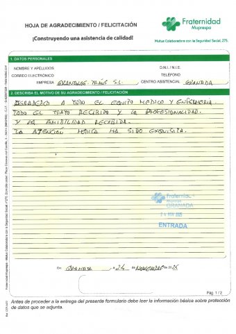 Agradezco a todo el equipo médico y enfermería. Todo el trato recibido y la profesionalidad y la amabilidad recibida. La atención médica ha sido exquisita.