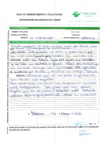 Quería agradecer el trato recibido tanto por Alicia, como por María, fisioterapeutas de rehabilitación. He estado veinte sesiones con ellas y puedo decir que son unas muy buenas profesionales. En mi caso, he tratado más con María, que era quien me llevaba, y ha sido un auténtico placer. Todos los consejos que me ha dado, siempre han funcionado. He aprendido a mirarme por dentro y escuchar mi cuerpo, además, cosas cotidianas que yo no daba importancia, han tenido una respuesta. Pero sobre todo, me llevo una experiencia humana muy enriquecedora. Solo puedo dar las gracias. Espero que, en el entorno laboral, esté bastante valorada tanto su profesionalidad, como su humanidad.