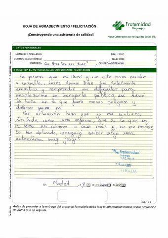 La persona que me llamó y me citó para acudir a consulta, Laura Aguado Díaz, fue totalmente empática y comprendió mi dificultad para desplazarme en transporte público, así buscó la hora en la que fuera menos peligroso y doloroso para mí. Esa actuación hizo que yo me sintiera tratada como una enferma, que es lo que soy, no como un número o caso más y, en ese momento tan delicado, consiguió subir algo una autoestima frágil.