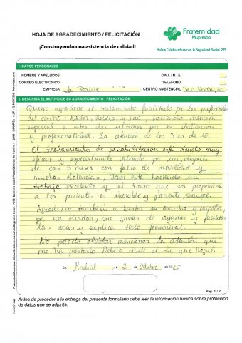 Quiero agradecer el tratamiento facilitado por los profesionales del centro: Néstor, Rebeca y Javi, haciendo mención especial a estos dos últimos por su dedicación y profesionalidad. La atención de los 3 es de 10. El tratamiento de rehabilitación está siendo muy eficaz y especialmente valorado por mí, después de casi 3 meses con falta de movilidad y muchas dolencias, Javi está haciendo un trabajo excelente y el trato que nos proporciona a los pacientes es increíble y paciente, siempre. Agradezco también a Néstor su escucha y empatía, por no olvidar, sus ganas de ayudar y facilitar las cosas y explica todo fenomenal. No puedo olvidar mencionar la atención que me ha prestado Rebeca desde el día que llegué.