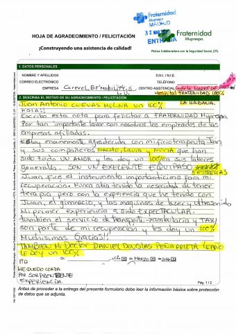 Hola!! Escribo esta nota para felicitar a Fraternidad-Muprespa por tan importante labor con nosotros los empleados de las empresas afiliadas. Estoy enormemente agradecida con mi fisioterapeuta Juan, y sus compañeros NACHO, Laura y Nuria que han sido todo un amor y les doy un 100% en sus labores generales. Son un EXCELENTE EQUIPAZO - 5 estrellas. Juan fue el instrumento importantísimo para mi recuperación Nunca había tenido la necesidad de tener terapia pero son la experiencia que he tenido con Juan, el gimnasio, y las máquinas de láser y ultrasonido. Mi primera experiencia ha sido EXPECTACULAR. También el servicio de transporte, ambulancia y taxi son parte de mi recuperación y les doy un 100%. Muchísimas gracias!! También mi Doctor DANIEL DOUGLAS PEÑARRIETA LEAÑO LE DOY UN 100%. P.D. Me quedo corta por sorprendente experiencia. Juan Antonio Cuevas Molina un 100%.