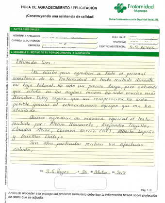 Les escribo para agradecer a todo el personal sanitario de La Fraternidad el trato recibido durante mi baja laboral. Ha sido un proceso largo, pero sabiendo que estaba en las mejores manos ha sido mucho más llevadero. Estoy seguro que mi recuperación ha sido posible gracias al extraordinario equipo que me ha atendido.