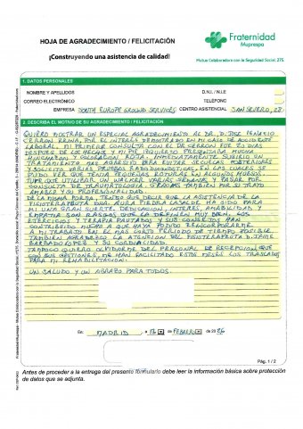 Quiero mostrar un especial agradecimiento al Dr. D. Jose Ignacio Cerrón Reina, por el interés demostrado en mi caso de accidente laboral. Mi primera consulta con el Dr. Cerrón fue 20 días después de los hechos y mi pie izquierdo presentaba mucha hinchazón y coloración roja. Inmediatamente sugirió un tratamiento más agresivo para evitar secuelas posteriores y solicitó varias pruebas radiodiagnósticas. En las cuales se pudo ver que tenía pequeñas roturas en algunos huesos. Tuve que utilizar una Walker varias semanas y pasar por consulta de traumatología. Gracias también por su trato amable y su profesionalidad. De la misma forma, tengo que decir que la asistencia de la fisioterapeuta Dña. Aurora Piedra Lasalde ha sido para mi una gran suerte. Dedicación, interés, amabilidad y empatía son rasgos que la definen muy bien. Los ejercicios y terapia pautados y sus consejos han contribuido mucho a que haya podido reincorporarme a mi trabajo en el más corto periodo de tiempo posible. También agradezco la atención del fisioterapeuta D. Jaime Barbado Lopez y su cordialidad. Tampoco quiero olvidarme del personal de recepción, que con sus gestiones, me han facilitado estos meses los traslados. Un saludo y un abrazo para todos.
