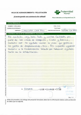He recibido muy buen trato y muchas facilidades por parte de las chicas de recepción, Cintia y Patricia, también me ha ayudado mucho la chica que gestiona los gastos de desplazamiento, Iria. Por supuesto agradecer también a la fisioterapeuta Yolanda por haberme ayudado tanto en la rehabilitación.