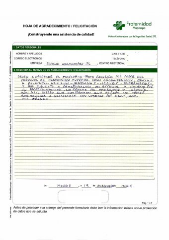 Deseo agradecer el magnífico trato recibido por parte del personal de Fraternidad-Muprespa. Gran organización, gracias a recepción - admisión - urgencias - médicos - enfermeros y por supuesto a rehabilitación, en especial a Helena por su profesionalidad, no exenta de amabilidad y cercanía, aun así, espero no tener que volver a coincidir con ustedes por aquí, ja ja. Mil gracias