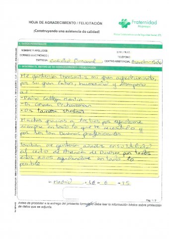 Me gustaría transmitir mi gran agradecimiento, por su gran labor, humanidad y desempeño a: Pedro Calleja Martin, Dra. Carmen Pecharroman, Dra. Tamara Shukair. Muchas gracias a los tres por ayudarme siempre en todo lo que he necesitado y por ser tan buenos profesionales. También me gustaría añadir en su totalidad al centro de Aranda de Duero por todos estos años ayudándome en todo lo posible.