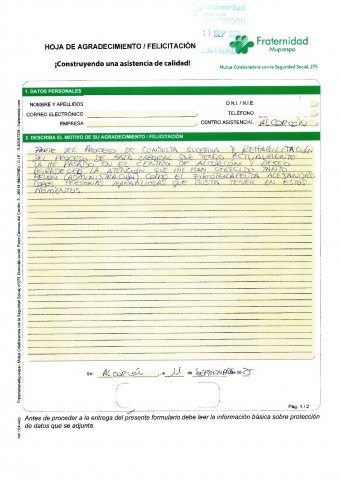 Parte del proceso de consulta sucesiva y rehabilitación del proceso de baja laboral que tengo actualmente la he pasado en el centro de Alcorcón y deseo agradecer la atención que me han ofrecido tanto Belén (administración), como el fisioterapeuta Alejandro Cobos, personas maravillosas que gusta tener en estos momentos.