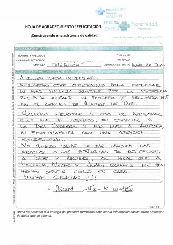 A quien pueda interesar, aprovecho esta oportunidad para expresar mi más sincera gratitud por la asistencia recibida durante mi proceso de recuperación en el centro de Madre de Dios. Quiero felicitar a todo el personal que me ha atendido, en especial a la Dra. Cabrera y aún más a Aurora, mi fisioterapeuta con una atención excepcional. No quiero dejar de dar también las gracias a las señoritas de recepción, a Isabel, Nacho y Juan, quienes me han hecho sentir como en casa. Muchas gracias!!!