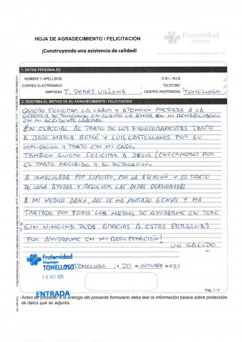 Quiero felicitar la labor y atención prestada a la gerencia de Tomelloso en cuanto a la ayuda en mi rehabilitación en mi accidente laboral. En especial al trato de los fisioterapeutas tanto a Jose María Belló y Luis Castellanos por su implicación y trato en mi caso. También quiero felicitar a Jesús (enfermero) por el trato recibido y su dedicación. A Inmaculada por supuesto, por la atención y el trato de cara ayudar y resolver las dudas ocasionadas. A mi médico Dany, que se ha portado genial y ha tratado por todos los medios de ayudarme en todo. ¡Sin ninguna duda gracias a estas personas por ayudarme en mi recuperación! Un saludo.