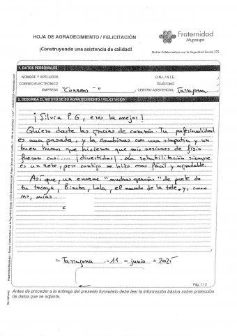 ¡Silvia P.G., eres la mejor! Quiero darte las gracias de corazón. Tu profesionalidad es una pasada, y la combinas con una simpatía y un buen humor que hicieron que mis sesiones de fisio fueran casi… ¡divertidas! La rehabilitación siempre es un reto, pero contigo se hizo más fácil y agradable. Así que, un enorme "muchas gracias" de parte de tu tocaya, Bimba, Lola, el mando de la tele y, cómo no, mías.