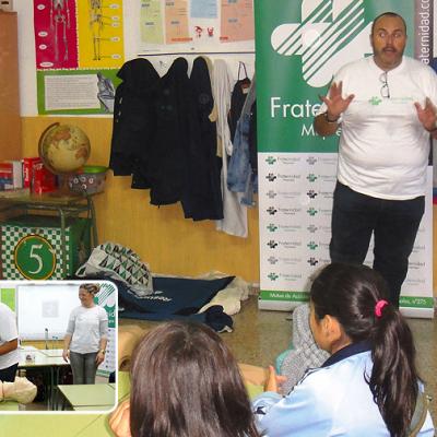 David Fernández Alonso e Sonia Mercader Adame, ambos os dous voluntarios de Fraternidad-Muprespa, realizaron para os nenos de 1° a 6° de primaria diferentes sesións adaptadas por idade. Nas devanditas sesións aprenderon sobre nocións básicas de reanimación cardiopulmonar, así como a importancia e o correcto emprego dos diferentes recursos do Servizo de Emerxencia (112).